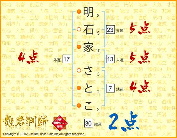 生活面を象徴する運勢です。外部から受ける影響力を表し、結婚運、家庭運や職場、環境への順応性を表します。総運から人運を引いた画数。姓や名が1文字の場合を除く。