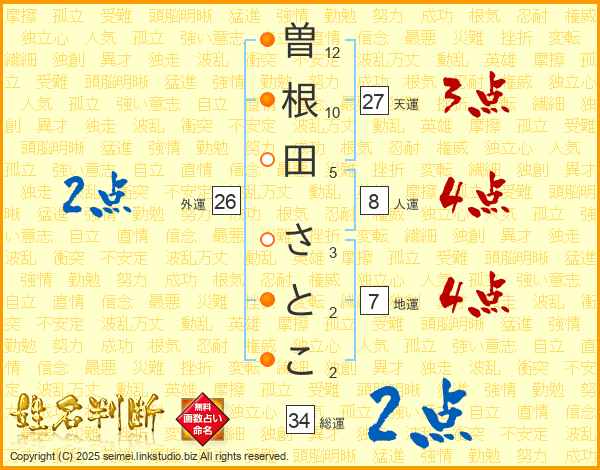 曽(12画)根(10画)田(5画) さ(3画)と(2画)こ(2画)