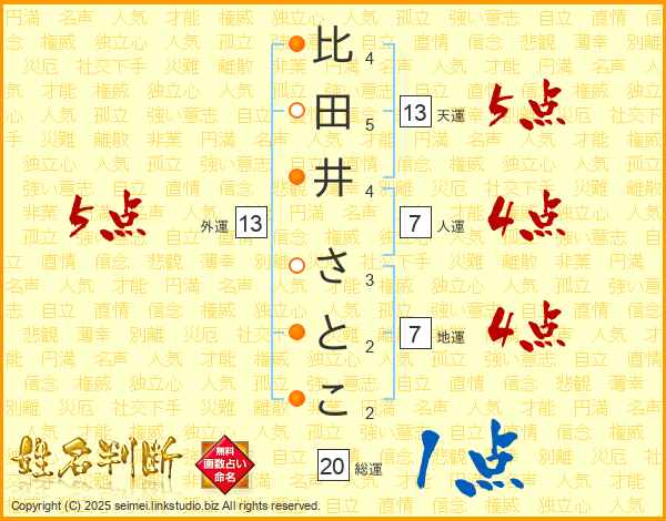 生活面を象徴する運勢です。外部から受ける影響力を表し、結婚運、家庭運や職場、環境への順応性を表します。総運から人運を引いた画数。姓や名が1文字の場合を除く。