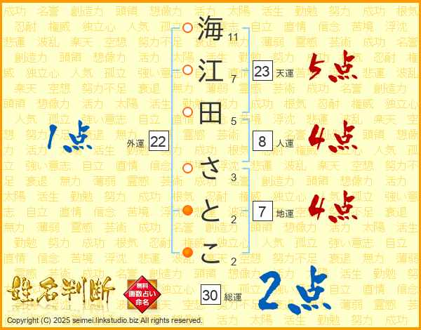 生活面を象徴する運勢です。外部から受ける影響力を表し、結婚運、家庭運や職場、環境への順応性を表します。総運から人運を引いた画数。姓や名が1文字の場合を除く。
