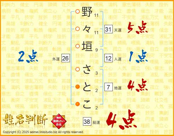 生活面を象徴する運勢です。外部から受ける影響力を表し、結婚運、家庭運や職場、環境への順応性を表します。総運から人運を引いた画数。姓や名が1文字の場合を除く。