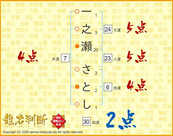 生活面を象徴する運勢です。外部から受ける影響力を表し、結婚運、家庭運や職場、環境への順応性を表します。総運から人運を引いた画数。姓や名が1文字の場合を除く。