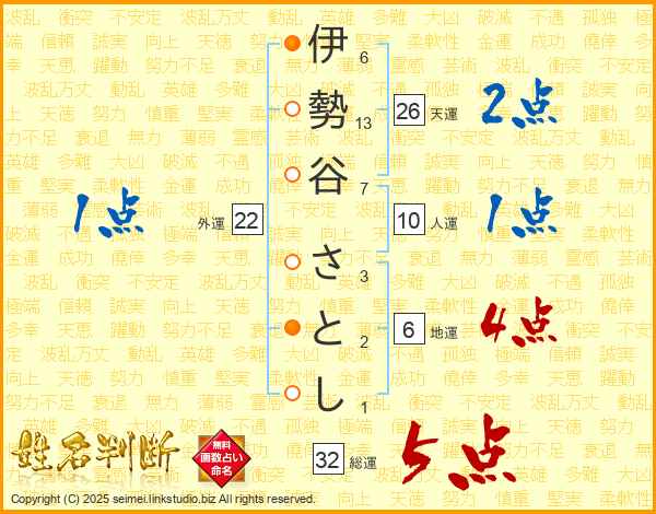 伊勢谷さとしさんの総運は32画の5点!