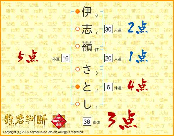 伊(6画)志(7画)嶺(17画) さ(3画)と(2画)し(1画)