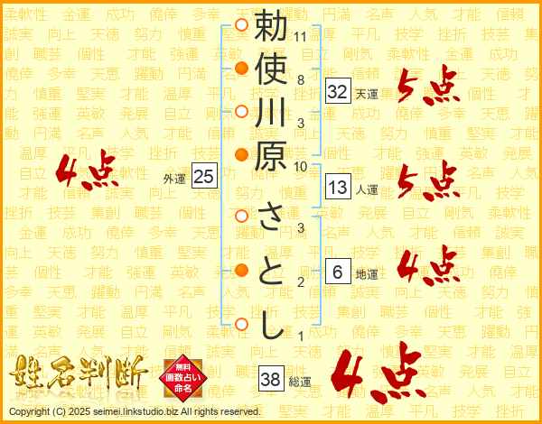 生活面を象徴する運勢です。外部から受ける影響力を表し、結婚運、家庭運や職場、環境への順応性を表します。総運から人運を引いた画数。姓や名が1文字の場合を除く。