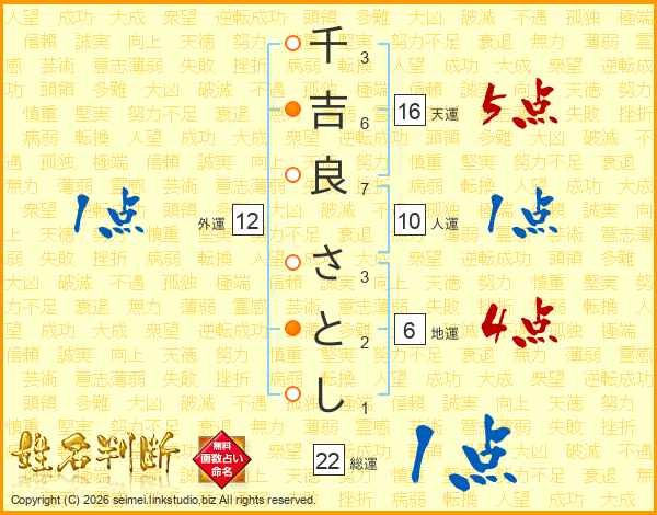 千(3画)吉(6画)良(7画) さ(3画)と(2画)し(1画)