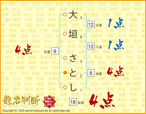 あなたの人生を表す1番重要な運勢です。生涯を通じて影響する総合運となり、主に50歳以降の晩年期に影響を及ぼします。苗字と名前の合計画数。