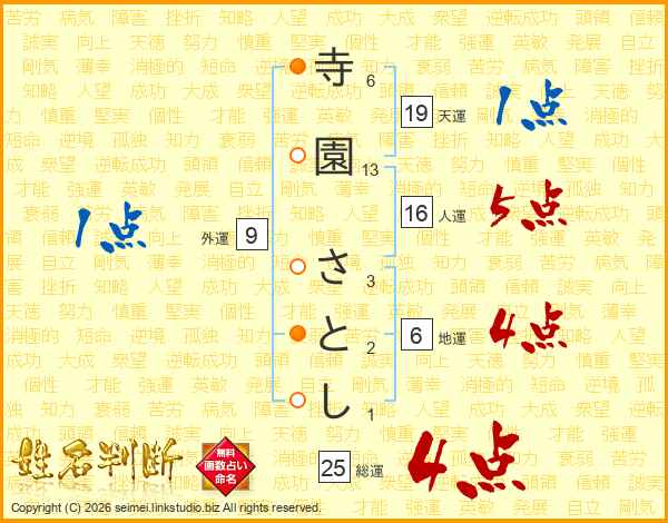 寺園さとしさんの総運は25画の4点!