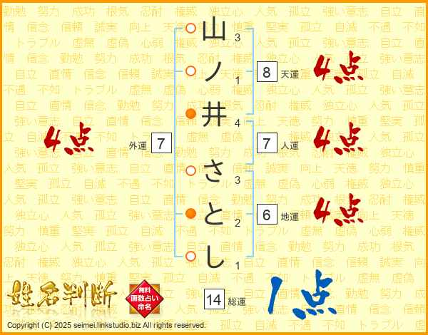 生活面を象徴する運勢です。外部から受ける影響力を表し、結婚運、家庭運や職場、環境への順応性を表します。総運から人運を引いた画数。姓や名が1文字の場合を除く。
