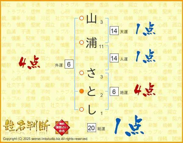 生活面を象徴する運勢です。外部から受ける影響力を表し、結婚運、家庭運や職場、環境への順応性を表します。総運から人運を引いた画数。姓や名が1文字の場合を除く。