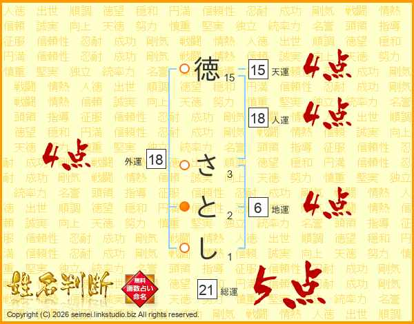 徳さとしさんの総運は21画の5点!