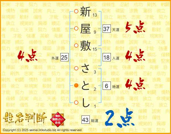 新(13画)屋(9画)敷(15画) さ(3画)と(2画)し(1画)