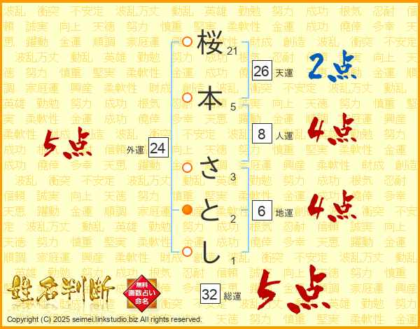あなたの人生を表す1番重要な運勢です。生涯を通じて影響する総合運となり、主に50歳以降の晩年期に影響を及ぼします。苗字と名前の合計画数。