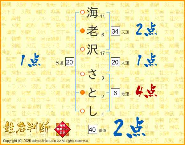 生活面を象徴する運勢です。外部から受ける影響力を表し、結婚運、家庭運や職場、環境への順応性を表します。総運から人運を引いた画数。姓や名が1文字の場合を除く。