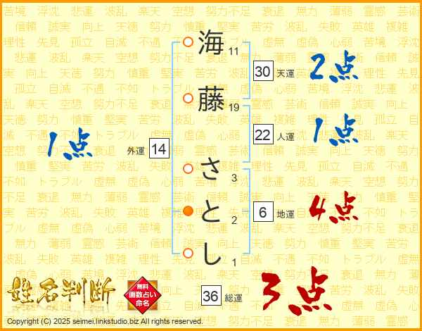 生活面を象徴する運勢です。外部から受ける影響力を表し、結婚運、家庭運や職場、環境への順応性を表します。総運から人運を引いた画数。姓や名が1文字の場合を除く。
