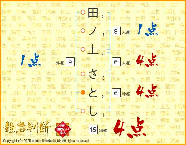 生活面を象徴する運勢です。外部から受ける影響力を表し、結婚運、家庭運や職場、環境への順応性を表します。総運から人運を引いた画数。姓や名が1文字の場合を除く。