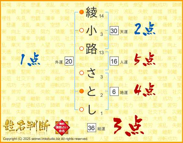 綾(14画)小(3画)路(13画) さ(3画)と(2画)し(1画)