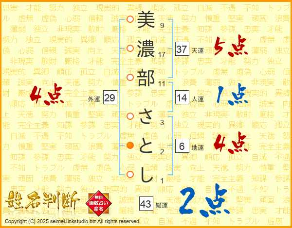 生活面を象徴する運勢です。外部から受ける影響力を表し、結婚運、家庭運や職場、環境への順応性を表します。総運から人運を引いた画数。姓や名が1文字の場合を除く。