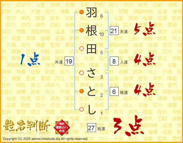 羽(6画)根(10画)田(5画) さ(3画)と(2画)し(1画)