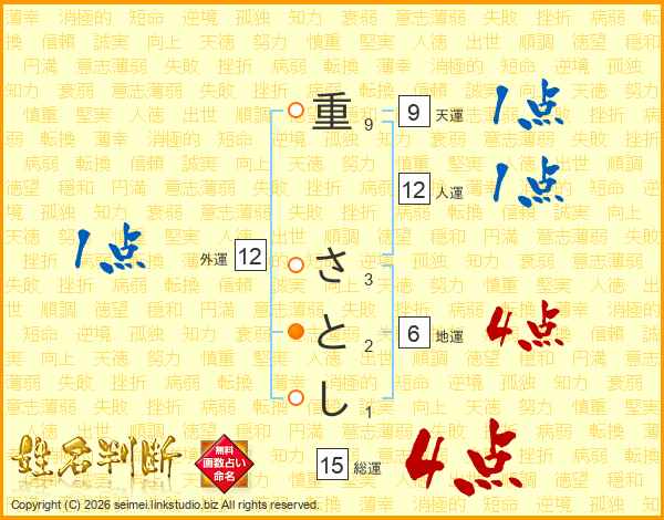 あなたの人生を表す1番重要な運勢です。生涯を通じて影響する総合運となり、主に50歳以降の晩年期に影響を及ぼします。苗字と名前の合計画数。