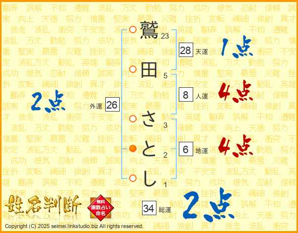 鷲(23画)田(5画) さ(3画)と(2画)し(1画)