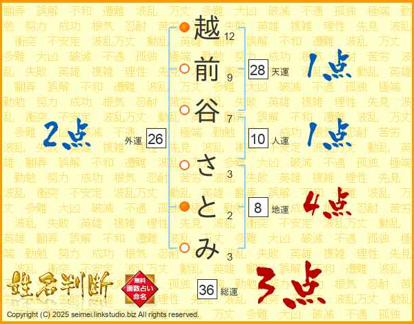 生活面を象徴する運勢です。外部から受ける影響力を表し、結婚運、家庭運や職場、環境への順応性を表します。総運から人運を引いた画数。姓や名が1文字の場合を除く。