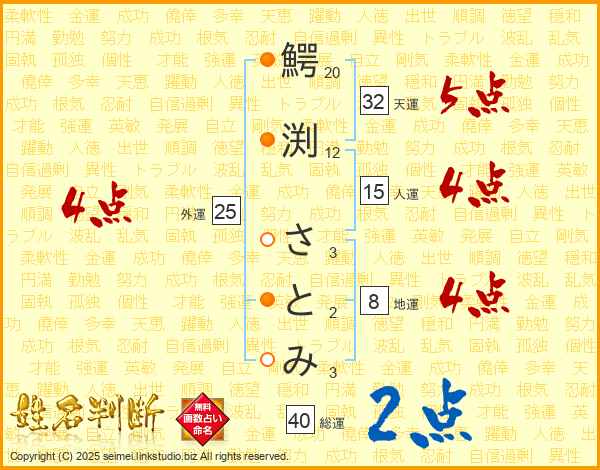 生活面を象徴する運勢です。外部から受ける影響力を表し、結婚運、家庭運や職場、環境への順応性を表します。総運から人運を引いた画数。姓や名が1文字の場合を除く。