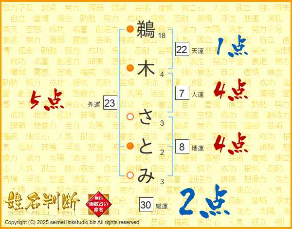 鵜(18画)木(4画) さ(3画)と(2画)み(3画)