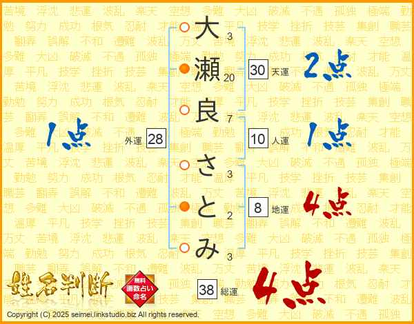 大(3画)瀬(20画)良(7画) さ(3画)と(2画)み(3画)