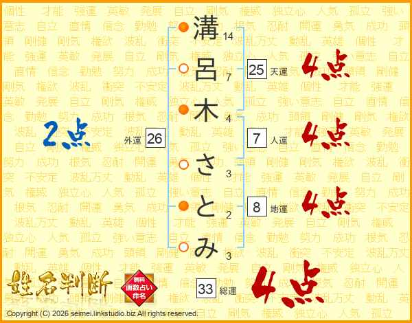 生活面を象徴する運勢です。外部から受ける影響力を表し、結婚運、家庭運や職場、環境への順応性を表します。総運から人運を引いた画数。姓や名が1文字の場合を除く。