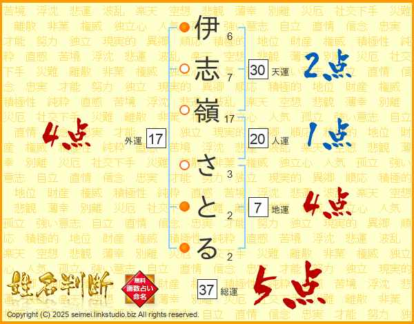伊(6画)志(7画)嶺(17画) さ(3画)と(2画)る(2画)