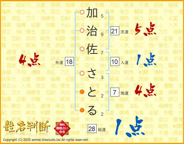 加(5画)治(9画)佐(7画) さ(3画)と(2画)る(2画)