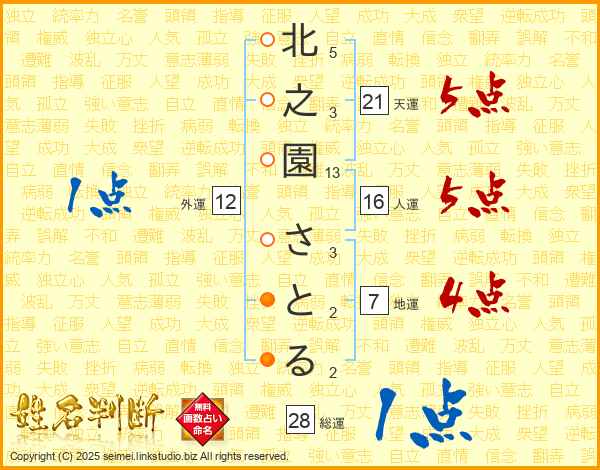 あなたの人生を表す1番重要な運勢です。生涯を通じて影響する総合運となり、主に50歳以降の晩年期に影響を及ぼします。苗字と名前の合計画数。