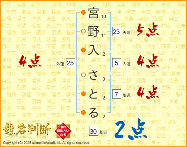 生活面を象徴する運勢です。外部から受ける影響力を表し、結婚運、家庭運や職場、環境への順応性を表します。総運から人運を引いた画数。姓や名が1文字の場合を除く。