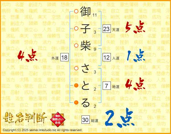 御(11画)子(3画)柴(9画) さ(3画)と(2画)る(2画)