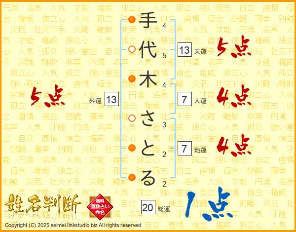 生活面を象徴する運勢です。外部から受ける影響力を表し、結婚運、家庭運や職場、環境への順応性を表します。総運から人運を引いた画数。姓や名が1文字の場合を除く。