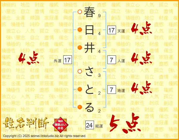生活面を象徴する運勢です。外部から受ける影響力を表し、結婚運、家庭運や職場、環境への順応性を表します。総運から人運を引いた画数。姓や名が1文字の場合を除く。