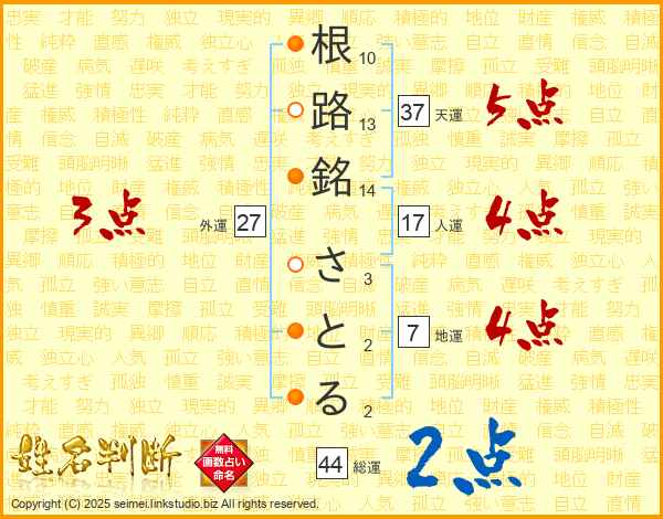 あなたの人生を表す1番重要な運勢です。生涯を通じて影響する総合運となり、主に50歳以降の晩年期に影響を及ぼします。苗字と名前の合計画数。