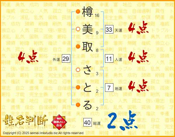 あなたの人生を表す1番重要な運勢です。生涯を通じて影響する総合運となり、主に50歳以降の晩年期に影響を及ぼします。苗字と名前の合計画数。