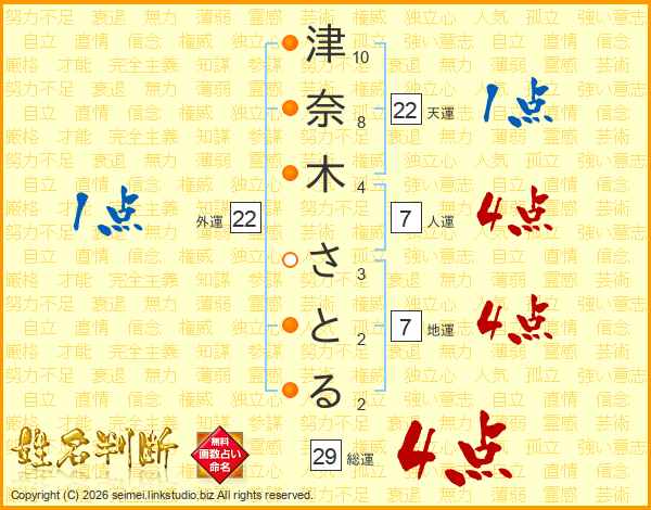 津(10画)奈(8画)木(4画) さ(3画)と(2画)る(2画)
