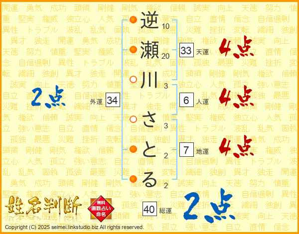 生活面を象徴する運勢です。外部から受ける影響力を表し、結婚運、家庭運や職場、環境への順応性を表します。総運から人運を引いた画数。姓や名が1文字の場合を除く。