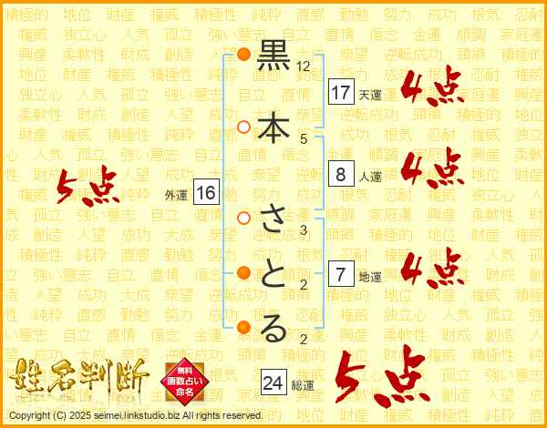 あなたの人生を表す1番重要な運勢です。生涯を通じて影響する総合運となり、主に50歳以降の晩年期に影響を及ぼします。苗字と名前の合計画数。