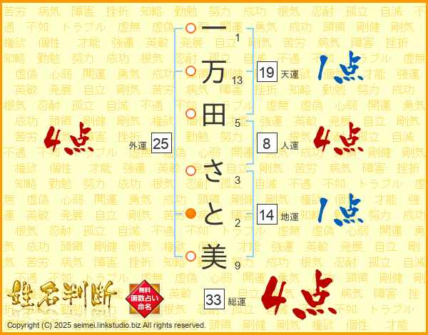 生活面を象徴する運勢です。外部から受ける影響力を表し、結婚運、家庭運や職場、環境への順応性を表します。総運から人運を引いた画数。姓や名が1文字の場合を除く。