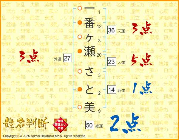 一(1画)番(12画)ヶ(3画)瀬(20画) さ(3画)と(2画)美(9画)