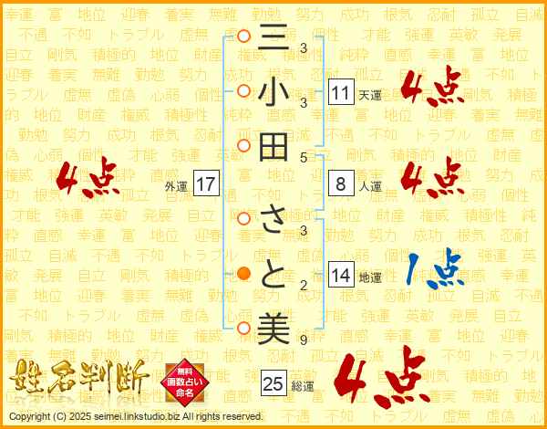 生活面を象徴する運勢です。外部から受ける影響力を表し、結婚運、家庭運や職場、環境への順応性を表します。総運から人運を引いた画数。姓や名が1文字の場合を除く。