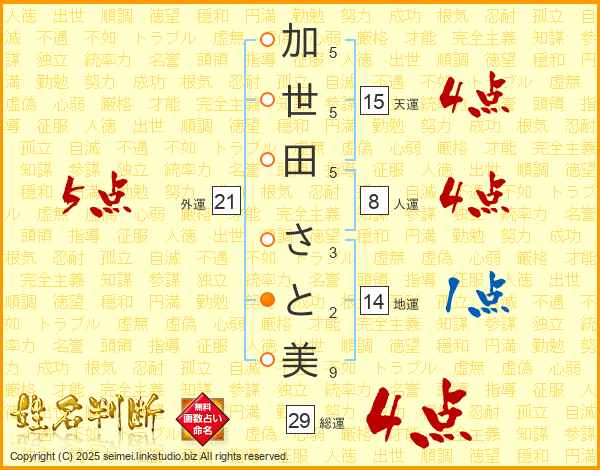 加世田さと美さんの総運は29画の4点!