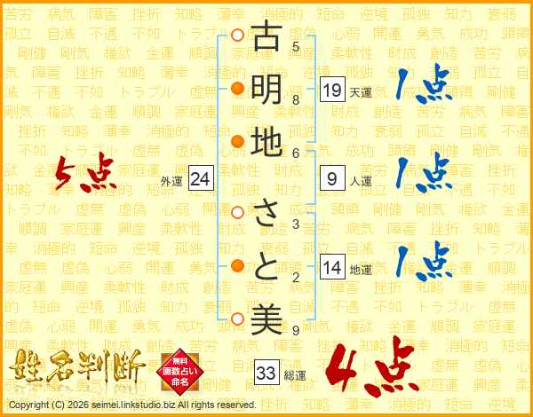 古(5画)明(8画)地(6画) さ(3画)と(2画)美(9画)