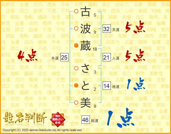 古(5画)波(9画)蔵(18画) さ(3画)と(2画)美(9画)