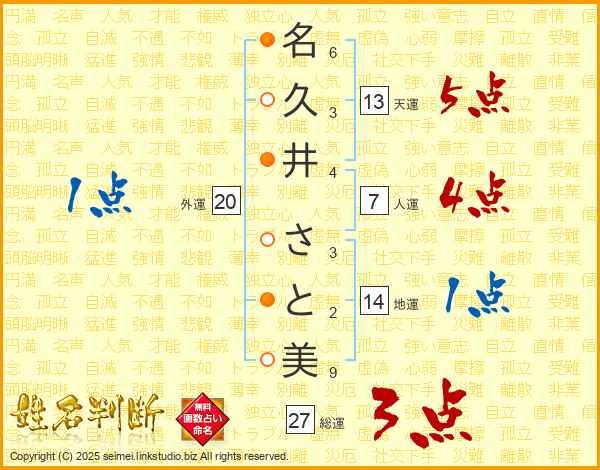 名(6画)久(3画)井(4画) さ(3画)と(2画)美(9画)