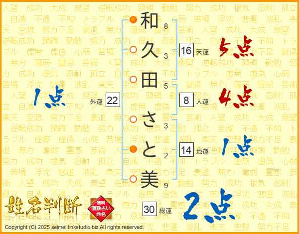 生活面を象徴する運勢です。外部から受ける影響力を表し、結婚運、家庭運や職場、環境への順応性を表します。総運から人運を引いた画数。姓や名が1文字の場合を除く。